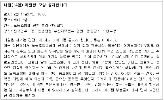 올 2월 노동조합 추진위원회를 결성했다. 하지만 한 두 사람 외에는 노동조합의 경험이 전무한(노동자로서의 지위를 얻어 본 적이 없었기에) 상황이라 무엇부터 해야 할 지 감이 오질 않았다. 민주노총부산본부와 언론노조의 도움을 받았다. 노동자로서의 정체성을 가지는 것과 노동조합의 필요성에 대한 공감대를 형성하는 것이 가장 중요하다 했다. 없는 형편에도 불구하고 강사료를 짜내 3차례에 걸쳐 특강도 진행했다. 예전에는 누가 잡아갈까봐 이런 걸 몰래 했다고 한다. 꽃은 봄날에 피고 봄날은 앞서 고생한 분들에 의해 오는 것이구나 하는 생각이 들었다.