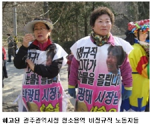 2007년 3월 7일 속옷만 걸친 40-50대 아주머니들이 구호를 외치고 눈물로 호소하는 모습의 동영상이 인터넷 이곳저곳에서 돌아다녔다. 상황을 간단히 이야기 하면, 광주광역시청 청사 청소 일을 맡고 있던 아주머니들이 자신들의 일자리를 보장해 달라는 내용이었다. 시청 건물의 대부분, 유리창, 계단, 복도, 화장실 등 아주머니들이 쓸고 닦던 그 일을 계속하게 해달라는 것이었다. 그동안 종처럼 일만 하다, 정말 종처럼 허드렛일만 하다가 사람대접 조금 받기 시작하면서부터 탄압은 시작 되었다. 종처럼 일만 하다가 노동자의 권리를 찾기 위해 노동조합을 만들었다. 관리자들의 너무 지나친 대접에 더 이상 참지 못하고 최소한의 권리라도 찾자고 한 것이다. 광주시는 이를 용납하지 않았다. 노동조합을 만드는 것은 괘씸죄에 해당한다. 민주노총이 없어져야 경제가 살아난다고 믿는 박광태 시장이다. 그런 시장에게 광주시청 비정규직 노동자들은 괘씸죄의 한 가운데 있었다. 노동조합을 만든 시청 청소용역 아주머니들, 그 중에서도 노동조합 가입한 조합원들만 계속 고용이 거부된 것이다. 청사가 새로 지어질 때부터 궂은일은 도맡아 해왔고, 심지어 시청 직원들 체육대회 행사 설거지까지 했던 아주머니들, 그 아주머니들이 노동조합을 만들었기 때문에 벌어진 일이다. 몇 년 동안 같은 장소에서, 같은 일을 해오던 분들이 노동조합을 만들어 일할 권리, 계속 일할 권리를 보장 받기 위해 시장면담을 요구했다. 하지만 돌아오는 답은 ‘용역업체 사장에게 말하라'였고, 광주시는 모르쇠로 일관했다. 농성이 길어지고 해결점은 찾지 못하고 있는데 광주시는 관련부서(회계과) 직원들을 중심으로 농성 중인 아주머니들을 강제로 끌어내었다. 그 과정에서 시청직원들의 폭력과 폭언, 이불에 둘둘 말아 김밥 꼴로 끌어내던 직원들은 어제까지 동료라고 생각해왔던 사람들이다. 그렇게 광주시청비정규직 아주머니들은 시청에서 쫓겨나게 되었다.