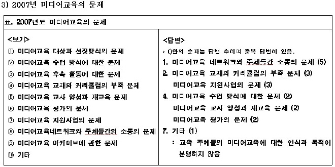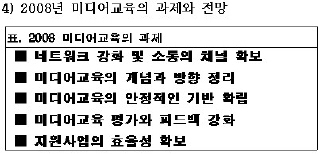 들어가며 지난 12월 26일, <미디어로 여는 세상>에서는 2007년 한 해 동안 미디어교육이 어떻게 성장, 변화해 왔는지 알아보기 위해 특집 프로그램을 기획했다. 2007년은 여러 지역에 미디어센터가 문을 열었고 다양한 단체와 기관들이 미디어교육을 했으며 이에 대한 다양한 지원이 되었던 해였다. 다시 말해 미디어교육에 대한 관심과 함께 실질적인 교육의 양도 늘어난 해였던 것이다. 그렇지만 양적인 증가가 곧장 질적인 성장으로 이어지지는 것은 아니듯, 2007년 한 해 동안 미디어교육은 여러 가지 새로운 과제들을 남겼다. 이러한 시점에서 미디어교육과 관계를 맺고 있는 사람들은 지난 한 해의 미디어교육을 어떻게 평가하는지 알아보고자 프로그램을 기획한 것이었다.제작진은 ‘2007년 미디어교육 평가 및 2008년도 전망'이라는 이름으로 간략한 설문지를 작성하였다. 설문지에는 지난 2007년 한 해 동안 미디어교육의 주체들이 어떤 일에 중점을 두었고 어떤 이슈에 관심을 가졌었는지, 그리고 미디어교육의 문제는 무엇이며 그 문제들을 해결하기 위해 필요한 것이 무엇인지를 묻는 내용을 담았다. 설문은 전국미디어교육네트워크에 가입한 단체나 개인 활동가들, 그리고 지원기관의 미디어교육 관계자 중에서 기관 성격별로 2~3인을 무작위로 선발해 실시했다. 1) 제작진은 전화설문과 e-mail 회신 두 가지 방법으로 설문을 진행했고 최종적으로 15인의 미디어교육 관계자들에게 올 한해의 미디어교육 평가와 2008년도의 과제에 대해 이야기를 들을 수 있었다. 하지만 미디어교육과 관련한 다양한 주최들을 7개 분야로 단순 분류하고, 그 안에서 무작위로 2~3인을 추출해 15인의 이야기를 들은 것으로 ‘설문조사'라고 하기에 참으로 모자라는 것이 많다. 일단 인원수 자체도 설문조사로서의 통계적 의미를 갖기 어렵기도 하거니와 각 단위들이 한 가지 성격의 사업만 하는 것도 아니기 때문이다. 게다가 설문의 내용도 모호한 지점이 많다. 약간의 변명을 하자면 다양한 주체들이 다양한 방법으로 이끌어온 미디어교육을 단순화시켜 평가해 보고자 했던 것 자체가 어쩌면 무모한 시도였다는 것과 <미디어로 여는 세상>의 제작 여건상 프로그램 제작 시간이 넉넉지 못했다는 것을 이야기하고 싶다. 물론 이러한 변명이 설문의 객관성을 보완해 주는 것은 아니지만 그럼에도 불구하고 이번 설문은 다양한 단위의 의견을 모아본 첫 시도였으며 이는 분명 미디어교육과 관계하고 있는 많은 단위들에게 한번쯤 생각해 볼거리를 제공한다는 것에서 유의미하다고 하겠다. 그러니 뭐 이따위 설문을 가지고 왈가왈부 하느냐고 노여워 마시고 ‘이런 의견들이 있구나' 정도로 이해해 주시길 바란다. 설문분석 먼저 설문에 응한 15인의 활동 지역을 살펴보면 서울, 경기지역이 11명으로 가장 많았고 전국이 2명, 충청도와 전라도가 각각 1명씩이었다. 미디어교육 사업에서 구체적으로 담당하고 있는 분야는 미디어교육 지원 사업 2) - 미디어교육 교사 - 미디어교육 기획 - 미디어교육 연구 순으로 나타났으며 중복으로 업무를 담당하는 경우도 있었다. 제작진은 설문조사의 결과를 2007년의 중점 사업, 2007년 미디어교육의 변화와 성과, 2007년 미디어교육의 문제, 2008년 미디어교육의 과제와 전망 이렇게 4가지로 나누어 분석해 보았다. 1) 2007년 중점 사업 설문에서는 2007년 한 해 동안 미디어교육과 관련해 각 단위들이 어떤 사업에 중점을 두었는가와 한 해 동안 미디어교육 전반에 있어서 설문 참여자 개인이 어떤 분야에 주목했냐는 질문을 나누어서 던졌다. 각 단위들이 올 한해 집중한 부분과 개인이 관심을 가졌던 이슈를 분리해 보고자 한 질문이었다. 하지만 설문조사 결과, 이 두 가지 사이에 큰 차이는 없었다. 그래서 두 가지 질문을 분리시키지 않고 의견들을 한데 모았으며 주관식 문항이었던 만큼 다양하게 나온 답변들을 유목화 시켜 크게 네 가지로 정리하였다. 설문 참여자들은 먼저 미디어교육 기반을 조성하는 다양한 활동 을 지난 한해의 중점 분야로 꼽았다. 거기에는 교재와 커리큘럼 개발, 교사 양성, 읽기교육 강화와 교육기관과의 협력체계 구축 등 미디어교육을 보다 효과적으로 진행하기 위한 것들이 포함되었다. 이런 미디어교육 기반 조성에 중점을 둔 이유에는 미디어교육의 교육 참여자가 다양해지고 장기적인 차원에서의 접근이 필요하기 때문에 그 기반 조성이 중요하다는 의견이 있었고 실제로 교육현장에서 사용할 수 있는 실용적이고 교육 참여자의 특성에 맞는 교재와 교사, 그리고 교수법이 부재하기 때문이라는 의견이 있었다. 그리고 교육과정이 바뀌면서 ‘매체언어'라는 국어과의 선택교과가 생겼지만 그것을 제대로 소화하고 실행할 기반이 갖춰지지 않아 이러한 기반 형성을 위해 교사와 교재, 커리큘럼 개발이 시급하다는 의견이 있었다. 이 밖에도 교재 개발을 위한 지원금이 마련되고 있다는 점, 미디어교육의 목적성을 분명히 하기 위한 기반 조성이 필요하다는 점 등이 미디어교육의 기반 조성에 집중한 이유로 나타났다. 미디어교육 기획 및 진행에서는 청소년(학교 안/밖으로), 장애인, 노