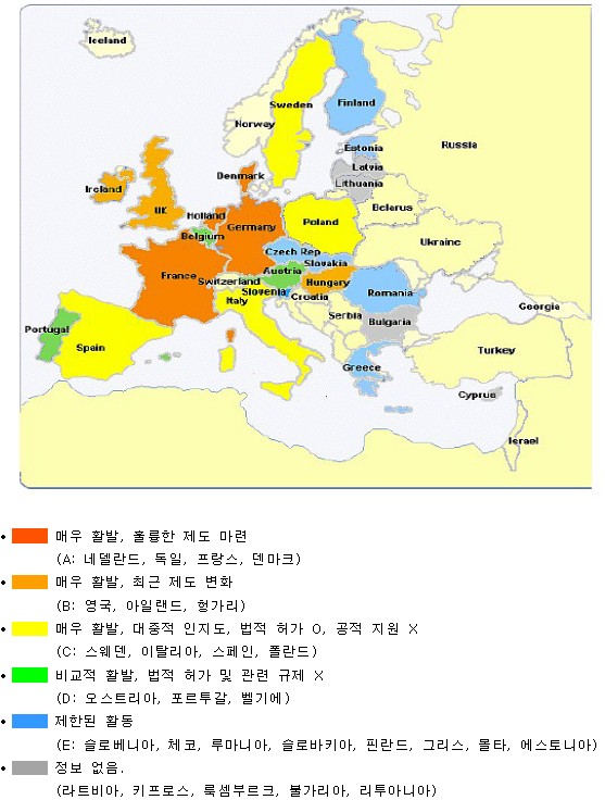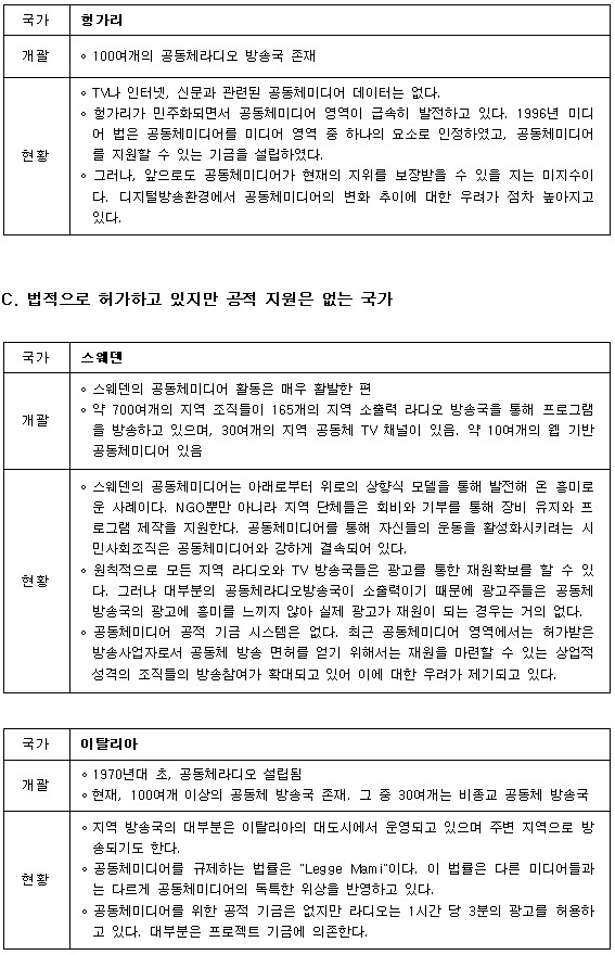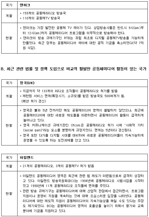 A. 매우 활발한 공동체미디어 활동과 관련 규제가 잘 마련되어 있는 국가 |