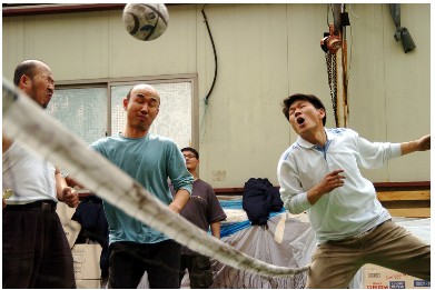 소규모 철강업체에 다니는 문씨의 하루 일과를 풀어쓴 이야기다. 아침 일찍 일어나 지하철로 출근한다. 그의 부인은 새벽에 어딘가에서 일을 마치고 퇴근한다.부부가 한 집에 살지만 출퇴근을 거꾸로 하니 이게 가족의 정상적인 가족의 모습인가. 아무런 감흥 없는 무감각한 지하철 출퇴근이다. 따분한 일상사의 하루를 지하철 차창 밖으로 지나는 생기 없는 도시의 모습과 흡사하다. 무가지 찌라시를 보는 장면과 찌라시 쟁탈전을 벌이는 할아버지들 모습이 오버랩 되었다며 좀 더 극적이었을텐데 아쉬움이다. 출근길에서 만난 선배 동료와 한 대의 담배를 피면서 정말 좋은 날씨를 느껴볼 수도 없음에 오히려 세상에 잠시 욕 한번 하고, 공장의 하루를 시작한다. 어제 술 여독이 풀리지 않아 몰래 산소용접기로 라면을 끓여 먹고 속을 풀려는 강씨의 모습이 영세 공장 노동자의 빠듯한 삶의 모습을 보여 준다. 대공장 노동자들이라면 이보다는 훨씬 안정된 휴식 공간이 확보되어 있을 텐데, 물론 자본가와 관리자들은 더 말 할 것도 없고... 공장의 거대한 선반 등의 기계들이 돌아가고, 용접하고, 절단하고, 제도하면서 어느덧 점심 시간이 된다. 얼마나 재미없는 곳인지 점심 먹는 시간이 기다려지는 곳이니, 군대와 다를 바 없는 곳이다. 인간의 삶을 실현하는 노동이란 말과는 한 참 동떨어져 있는 것이 영세 공장 노동자들의 삶임을 보여준다. 점심내기로 족구하는 모습은 그래도, 아직 사람 사는 냄새가 나는 모습이다. 서로 부대끼며 온기를 나눌 수 있는 시간, 그런데, 왜 이리 군 생활과 비슷한 느낌일까. 한국사회는 병영 사회다. 특히 공장을 비롯한 작업장은 병영문화를 그대로 옮겨온 듯하다. |