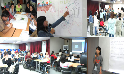 5) 장애인교육(특수교육)과 사회복지 그리고 장애인운동에서의 미디어교육 지금 장애인 미디어교육은 크게 세 가지 영역에서 이뤄지고 있다. 장애인교육(특수교육), 사회복지, 장애인운동의 각 교육방향성에 따라 진행되고 있다. 그 방향성이 아직 명확하지는 않지만 정리해 보면, 장애인교육(특수교육)은 의사소통 교육으로, 사회복지는 지역조직화 차원에서 장애인주체화(empowerment 임파워먼트)로, 장애인운동은 장애인이 주체적으로 장애인운동의 이슈를 담론화 하는데 의미가 있다고 할 수 있겠다. 이 세 가지 영역의 교육방향성은 앞으로 사회적 논의를 통해 설정될 필요가 있다. 미디어교육이 장애인과 어떻게 만날 것인가를 정하는 중요한 기준이 되기 때문이다. 6) 변화되고 있는 장애인 미디어 상황 최근에 장애인 미디어운동은 방송과 정보통신 서비스의 혜택을 장애인도 받을 수 있도록 하는 보편적 서비스 보장 운동에서 영화제, 미디어센터 설립, 방송모니터운동, 영상제작 활동으로 발전해 가고 있다. 영화제는 장애인이 직접 만든 영화와 장애인 관련 영화 그리고 일반 영화를 장애인이 볼 수 있는 기회와 소통 채널로서 <한국농아인협회>와 <한국장애인연맹 제주DPI> 그리고 <420장애인차별철폐공동투쟁단>에서 영화 상영회를 실시하고 있다. 그리고 사전제작지원 공모를 통해 제작비를 지원해주거나 영상제작워크숍을 실시하고 있기도 하다. 방송모니터운동은 <장애우권익문제연구소 문화센터>가 장애인권적 관점에서 장애 왜곡 내지 편견을 조장하는 방송을 비판하고 장애인의 부정적 이미지를 개선하기 위해 2001년부터 방송모니터 활동을 하고 있다. 장애인 미디어센터는 <한국장애인단체총연맹>이 지원을 받아 ‘바투’라는 이름으로 지난 18일에 개관해서, 2007년 1월부터 방송관련 강의와 장비 대여 그리고 미디어를 응용한 창업활동과 취업 지원 계획을 가지고 있다. 장애인의 영상제작활동으로는 농인독립영상제작집단 <데프미디어>의 농인영화 제작활동과 <다큐인>에서 제작하고 있는 RTV 시민방송의 ‘나는 장애인이다’라는 장애인방송프로그램이 있다. 이와 같이 장애인의 다양한 미디어활동이 다양하게 이뤄지고 있는데, 이러한 활동들이 어떻게 관계 설정을 하고, 역할 분담을 할 것인가에 대한 고민이 이뤄질 필요가 있다. 개별적으로 산발적으로 진행되고 있는 장애인 미디어 활동이 연대하고 소통해야 하는 것이다. 장애인 미디어운동의 전망을 함께 그리고 계획해 나가야 할 뿐 아니라 장애인 미디어활동이 지속적으로 이뤄지기 위해서는 활동력이 재생산될 수 있는 기반이 반드시 필요하기 때문이다. 한편, 미디어교육차원에서 변화되고 있는 장애인 미디어 상황에서 장애인의 미디어활동이 지속적으로 활발하게 이뤄질 수 있도록 장애인 미디어 활동가 양성 교육 및 재교육이 이뤄져야 할 것이다. 7) 장애인미디어교육네트워크 장애인 미디어교육을 하고 있거나 하고자 하는 단체와 미디어교육 교사 그리고 활동가들이 2005년에는 <가칭 장애인미디어교육네트워크>로 구성되어 매월 정보공유와 장애인 미디어교육 교사 및 기획자 양성을 위한 워크숍을 진행했다. 그리고 지난 12월에는 전주에서 2005년 장애인 미디어교육 평가를 위한 워크숍이 실시되기도 했다. 이러한 과정을 통해 오는 1월 11일에 <장애인미디어교육네트워크를 준비하는 모임(장미네준>의 첫 번째 회의가 있을 예정이다. 장애유형별 미디어교육을 진행했던 단체, 교사, 교육참여자 그리고 2007년에 장애인 미디어교육을 계획하고 있는 단체와 교사가 참석할 계획이다. 이번 회의에서는 장애인미디어교육네트워크의 지향점과 활동 계획을 논의하는 자리로서, 앞으로 장애인 미디어교육과 미디어운동의 연대 방안을 모색해 나갈 것으로 보인다.
