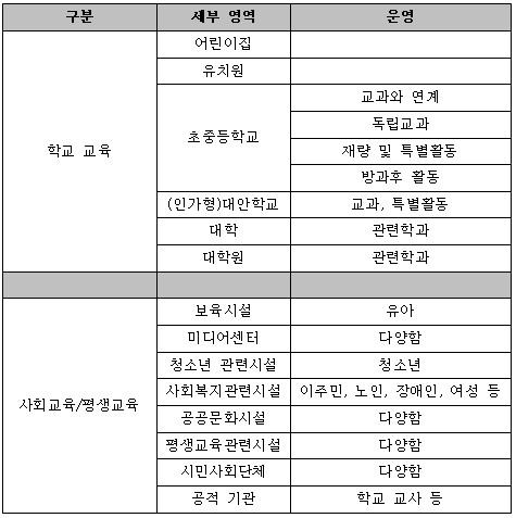 2-3. 교육 영역 현재 미디어교육이 이루어지는 곳을 정리하면 다음과 같다.