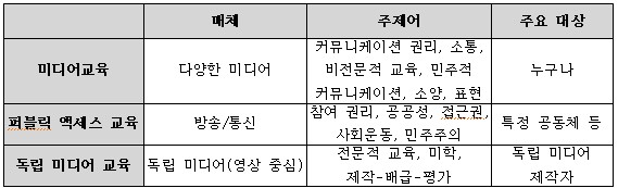2-4. 교육 내용 미디어센터의 교육영역이 학교-사회를 걸쳐, 문화적 교육 공간으로서 운영되는 상설강좌와 아웃리치 사업으로 설정되는 교육 등을 살펴보았다. 여기서는 미디어센터에서 주로 다루고 있는 교육 내용에 대해 간략히 언급하고자 한다. 미디어센터는 크게 세 가지 교육 내용을 갖고 있다고 볼 수 있다. 하나는 미디어에 대한 읽기, 쓰기, 나누기 능력을 다루는 미디어교육, 두 번째는 공공 미디어에 대한 접근과 참여를 만드는 퍼블릭 액세스 교육, 세 번째는 독립 미디어 제작자를 양성하고 활성화 시키는 독립미디어교육이다.