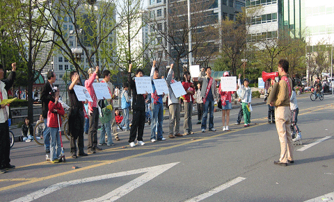 -. 4.29 안양 1번가에서 2차 가두홍보집회 및 안양방송 및 태광산업계열 관련 제품 불매운동 선포식. 예정 없던 민예총 사무국장 장승십자가 퍼포먼스가 같이 이루어짐