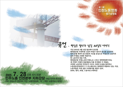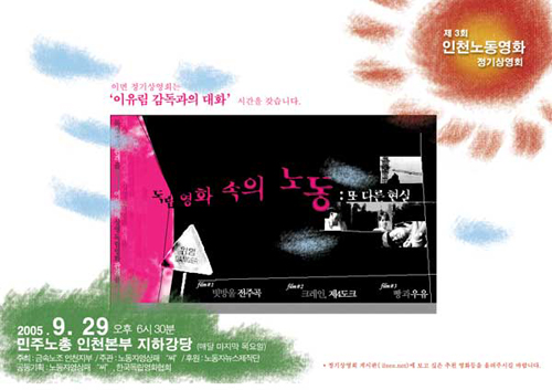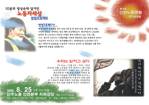 | 인천 노동영화 정기상영회: 노동자들의 대안적인 일상문화의 모색 최 영 준 (노동자 영상패 '씨') 1. 노동자들의 일상문화 노동자들의 일상속의 문화에서 영상매체는 어떤 지형 속에서 어떻게 작동하고 있는 것일까. 이 사회의 대부분의 다른 사회집단과 마찬가지로 노동자들 또한 자본주의 사회의 상업적 영상에 전적으로 포섭되어있다고 생각한다. 아마도 노동자들에게 있어 일상적으로 접하는 영상매체는 퇴근하고 집에서 시청하는 T.V.와 간헐적으로 보는 비디오가 전부일 것이다. 이러한 현상은 일반 노조원만이 아니라 노동조합에서 활동하는 노조간부들 또한 다르지 않다. 물론 파업현장이나 집회에서 대안적인 영상을 접하는 경우가 없는 것은 아니나 그것은 파업이나 집회라는 일시적인 시공간에 국한되는 것이고 그들이 다시 돌아간 집이나 동네에서 일상의 문화로 나타나는 현상은 아닌 것이다. 파업현장이나 집회의 문화가 중요하지 않은 것은 아니나 그러한 일시적인 시공간에 국한된 행사가 반복된다고 해서 대안적인 영상이 노동자들의 일상속의 문화가 되는 것은 아니다. 수 년 전부터 현대자동차 노동조합이 회사와의 단체협상 사항으로 매주 1회 점심시간에 현대자동차 영상패가 제작한 사내방송을 진행하고 있다. 그 중 매월 1회는 노동자뉴스제작단이 제작한 열열프로젝트라는 새롭고 흥미로운 프로그램으로 진행된다. 그러나 자신들의 사업장에서 상영되는 자신들의 이야기임에도 불구하고 현대자동차 노동자들의 반응은 제한적이라고 한다. 대부분은 얼른 점심식사를 끝내고 밖에 나가서 잠깐의 휴식을 취하려고 한다는 것이다. 사업장 내에서도 그러한데 퇴근하고 집에서의 노동자들의 문화는 상업적인 대중문화에 전적으로 포섭되어 있을 수밖에 없다. 영상만이 아니라 다른 여러 매체의 노동문화 경험을 본다면 노동자들의 대안적인 문화에 대한 관심은 파업시기에 국한되어 있다고 생각한다. 물론 과거에 노동자들의 대투쟁의 시기에는 많은 노동자들이 현재도 일부 노동자들은 적극적으로 풍물, 노래, 율동, 영상의 매체를 가지고 자신들의 대안문화를 일상적으로 향유하려고 노력하고 있다. 그렇지만 아쉽게도 일반적이지는 못하다. 노동자들의 대안적인 일상문화. 어떠한 하나의 획기적인 프로그램이 그것을 만들어 낼 수도 없고 문화적인 또는 정치적인 접근만 가지고도 그것이 해결될 수 없는 단기적인 목표의 문제가 아니라 장기적이고 복합적으로 접근해야 하는 과정의 문제일 것이다. 인천 노동영화 정기 상영회는 이러한 노동자들의 대안적인 일상문화에서의 영상이란 매체를 가지고 진행하는 하나의 모색이다. 오랫동안 꾸준하게 진행되려는 노동영화 정기상영회이지만 상당한 기간동안에는 소수의 노동자들만이 참가하는 작은 상영회에 머무를 것이다. 그렇지만 정기 상영회는 노동자들의 대안적인 일상문화를 만들려는 거대한 프로젝트의 작은 하나의 시도이자 실험이기 때문에 중요하다고 생각한다. ![]() 2. 왜 노동영화 정기 상영회라는 형식인가. 현장노동자들을 대상으로 기획하여 노동영화라는 제목을 가지고 있지만 우리는 노동자들이 향유해야 하는 영화가 노동자들이 나오는 노동자들의 현장에 대한 이야기여야만 하지는 않다고 생각한다. 노동자들이 살아가는 이 사회에 대한 모든 대안적인 영상들 여성, 환경, 인권 등등. 이 사회에 대하여 고민하는 다양한 주제와 다양한 형식의 영화들이어야 한다고 생각한다. 인천 노동영화 정기 상영회는 그러한 이유로 프로그램의 기획에 있어 노동자 영상패 “씨”를 중심으로 노동자뉴스제작단과 한국독립영화협회의 지원을 받아 진행하고 있다. 지금까지는 4회를 진행하면서 주로 노동을 소재로 한 다큐멘터리와 극영화를 상영하였지만 상영회가 자리를 잡아나가면 위에서 언급한 좀 더 다양한 소재와 형식의 영화와 영상물을 상영할 계획이다. 다음으로 왜 정기상영회인가에 대한 고민이다. 우리는 영화제라는 형식의 집중적인 프로그램도 중요하지만 또한 그만큼이나 소규모이면서도 여러 형식으로 진행하는 일상적이고 다양한 상영회가 지역에 뿌리를 가지고 있는 것이 중요하다고 생각한다. 영화제와 작은 상영회는 동시적으로 진행하고 모색되어야 하지만 지역에 영화제들이 몇몇을 제외하고는 대부분 많은 참여가 이루어지지 않는 점을 생각해보면 작은 일상적인 상영회의 중요성이 커진다고 생각한다. ![]() 3. 인천 노동영화 정기상영회의 현황 인천 노동영화 정기 상영회는 민주노총 금속노조 인천지부 주최, 노동자 영상패 “씨” 주관, 노동자뉴스제작단 후원, 노동자 영상패 “씨”와 한국독립영화협회 공동 프로그램기획으로 진행한다. 매월 마지막 주 목요일 6시 반에 민주노총 인천본부 지하 강당에서 진행하며 2005년 7월 28일 현대중공업 박일수 열사에 대해 노동자뉴스제작단에서 만든 [유언]을 1회 상영으로, 2회에는 현대자동차 노동조합 문화부와 노동자뉴스제작단이 현대자동차 사내방송 제작 프로그램으로 제작한 [열열프로젝트]와 하이닉스 매그나칩 사내하청지회의 [우리는 일하고 싶습니다] 3