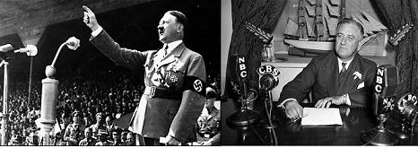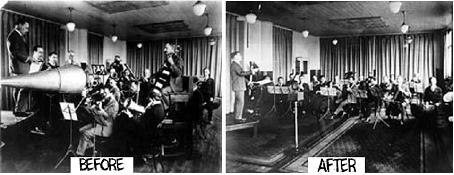한편, 목소리로 혹은 이런저런 소리로 승부를 거는 음악 텍스트의 영역에도 마이크의 위력이 미치지 않을 리 없다. 마이크는 음악의 스타일은 물론 그 음악을 듣는 우리들의 스타일까지도 쫙 바꾸어 버린 것이다. 마이크의 등장으로 인한 악기별 레벨의 평준화는 새로운 스타일의 합주를 가능하게 했으며 개별 연주자들에게 모두 ‘솔리스트’의 영예를 선사했다. 이제 어쿠스틱 기타도 광장에 설 수 있게 되었으며 광장의 바이올린 주자는 수십 명이 아니어도 좋았다. 또한 보컬은 혼자만의 개성 넘치는 매력적 칼라로 드넓은 대지를 품에 안았고 군중들은 그 목소리의 품에 안겼다. 또 마이크의 발전은 라디오 방송으로 이어져 사람들은 DJ라는 동시대의 새로운 뮤즈에게 저마다의 취향을 내맡겼다. DJ의 목소리는 귓가에 속삭이는 듯 했지만 알고 보면 엄청나게 멀리까지 뻗어나가는 소리였다. 19세기말과 20세기 초는 당대에는 희한한, 오늘날엔 익숙한 그런 발명품들이 속출하던 시기였다. 마이크가 출현한 시기나 축음기, 영사기, 전화기 등이 출현한 시기가 대충 그 시기이며 우리에게 익숙한 ‘발명왕’들인 에디슨, 벨, 벌리너 등이 모두 그 시절에 활발한 비즈니스를 하던 사람들이다. 알다시피 마이크의 출현도 그러한 발명의 물결 속에서 같이 이루어진 것이고 구체적으로는 전화기를 만드는 과정에서 비롯된 물건이었다. ![]() 마이크가 녹음에 사용되기 전과 후의 스튜디오 풍경이다. 마이크가 없을 때는 연주자들이 사다리 쌓듯 올라서고 우격다짐으로 낑겨 앉아야 겨우 알맞은 밸런스의 음악을 녹음할 수 있었다. 그러나 마이크가 등장하고 나자 원래 연주 대형을 지키면서 한결 편안하고 리얼한 연주와 녹음이 가능해졌다. 아, 잠깐 전화 토막 상식 하나. 지난 2002년, 미 의회는 전화기를 처음 발명한 사람이 벨이 아니라는 사실을 승인하였다. 100여년 만에 그 뒤늦은 영광의 자리를 되찾아 온 이는 이탈리아의 메우치라는 사람이다. 모진 가난 속에서 불행한 삶을 살다 죽었다는데 이런 늦어도 한참 늦은 결정이 고인에게 얼마나 위안이 될지는 모르겠다. 어쨌든 이 사건을 통해 벨은 ‘희대의 사기꾼’으로 재조명되고 있다는 소리도 들리고. 마이크는 19세기 말에 등장한 이래 지속적인 발전을 거듭했는데 주요하게는 음질 및 음량의 개선, 녹음의 지향성, 그리고 어느 정도까지의 경량화 정도가 추구되었다. 마이크의 무게는 지금도 그렇지만 제각각이었다. 1930년대 초에 개발되어 전 세계적으로 오래도록 사랑을 받았던 RCA의 44A 모델은 무게가 삼겹살 18인분에 해당되는 엄청난 수준이었다. 녹음의 지향성은 여러 고민과 실험을 거쳐 양지향성[bi-directional], 초지향성[shot gun], 무지향성[omni-directional], 단일지향성[cardioid] 등 오늘날의 포맷이 1930년대에 일찌감치 모두 만들어졌다. 음질 및 음량은 진공관 기술의 발전, 그리고 트랜지스터의 등장과 함께 지속적으로 나아졌다. 이미 1938년에 등장했던 서부전기[Western Electric]사(社)의 630A 모델에 이르면 재현 가능 주파수 범위가 30~15,000Hz에 이를 정도였다. (참고로 우리가 지금껏 듣고 있는 카세트테이프가 이 정도의 성능을 가지고 있으며 128Kb로 코딩된 일반적인 MP3의 경우도 이 정도 수준에 머물고 있다.) ![]() 미국이 마이크 기술의 발전을 주도했음에도 불구하고 음질의 측면은 독일에서 더욱 발전했고 그 효과는 지금까지도 여전하다. 미국이 모든 당대의 발명품과 대중문화를 주도하고 있었음에도 이러한 결과가 나왔던 이유는 당시 마이크의 주요 고객이었던 라디오 방송국들 때문이었을 것이다. 미국의 라디오 방송은 당시 FM 기술을 굳이 외면하고 AM을 사용하였는데, 그 즈음의 표준 주파수 대역은 5KHz 정도에 머물렀다. 따라서 20~20,000Hz에 이르는 것으로 알려진 가청 주파수 대역을 충실히 채우는 데에 노력을 경주하지 않았다. 반면 독일의 경우는 방송국을 나치 당국이 장악한 가운데 음질 개선에 주력한 경우였다. 아마도 히틀러가 PA(public address: 대중적 연설을 위한 음향 시스템을 통칭하는 말이다.) 시스템을 이용한 대중 연설에 많은 공을 들였던 것과 무관하지 않았을 터이다. 마이크는 악기 연주자들의 사랑을 극진히 받았음은 물론 독일의 독재자 히틀러에게도 완전 소중한 물건이었다. 앞에서도 잠깐 이야기했지만 마이크와 그것을 증폭하는 앰프 시스템이 없었다면 우리는 현대적인 의미의 대중음악 역시 상상할 수 없는 것이었다. 보헤미안 랩소디[Bohemian Rhapsody]의 중간 부분에서 오케스트라 및 대규모 합창부대와 1대 1로 맞서는 프레디 머큐리의 목소리는 다 마이크 덕택이다. 조지 해리슨이 <Sgt. Pepper's Lonely Hearts Club Band>에서 ‘Within You, Without You’를 통해 들려주는 인도 삘 만땅의 시타르의 압도적인 힘 역시 마이크가 없었다면 성취할 수 없었던 음악적 융합이었음은 물론이다. 그리고 히틀러의 선동 정치 역시 마이크가 없었다면 상상할 수 없는 일이었을 게다. 생각해 보면 히틀러는 당대 첨단 문명의 산물이기도 하다. 마치 포스트 신문[newspaper]세대 미국의 루즈벨트가 대통령에 오른 것이 일정 부분 첨단 미디어인 라디오의 산물이었던 것처럼